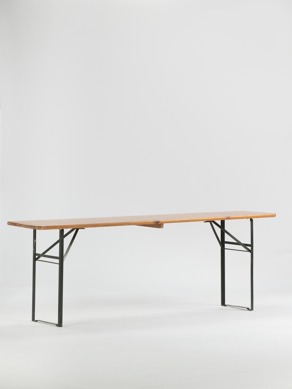Dinner table wooden pic-nic style, seats up to 8 people, with metal frame, in natural color.