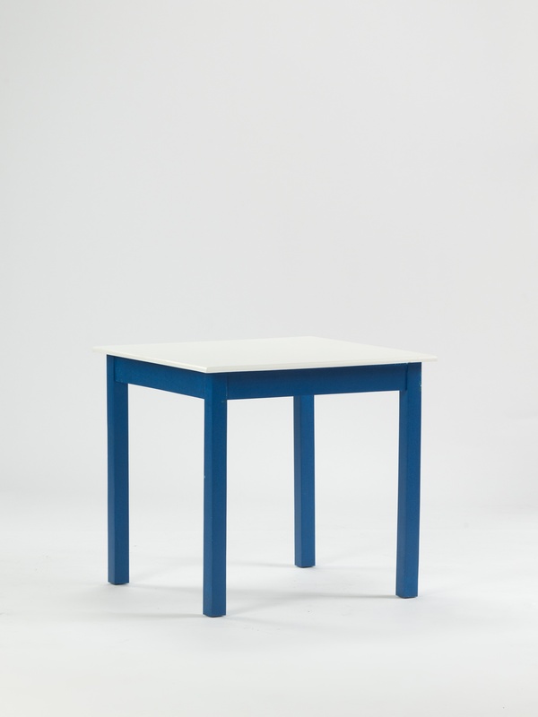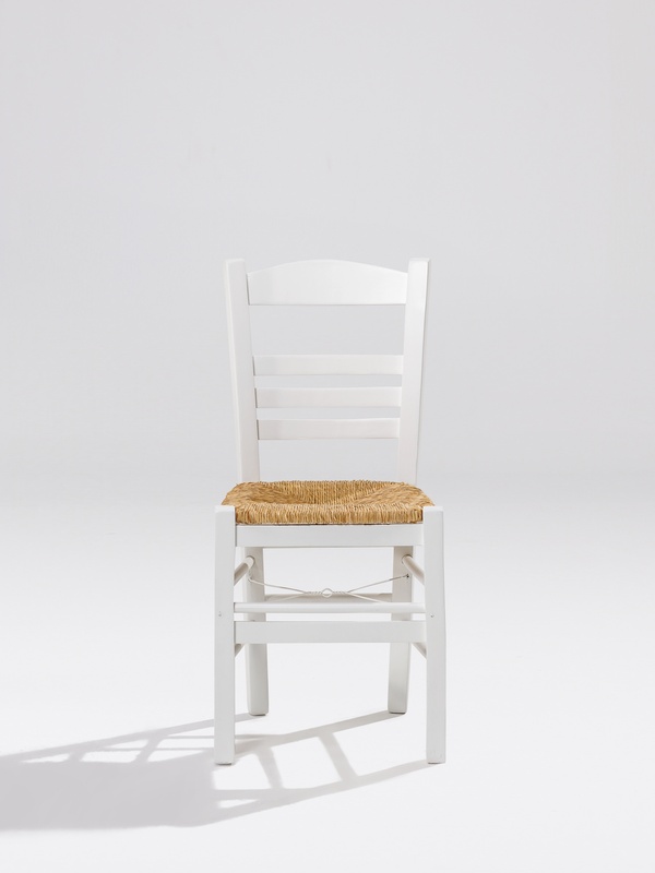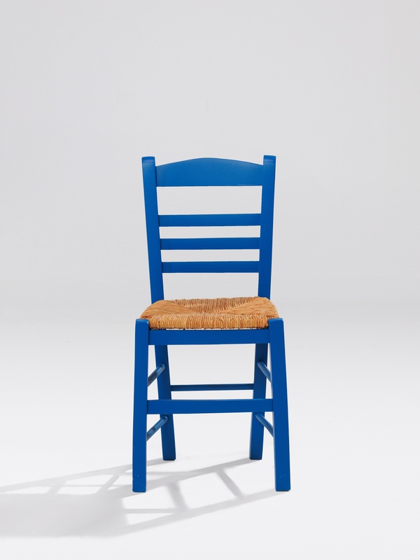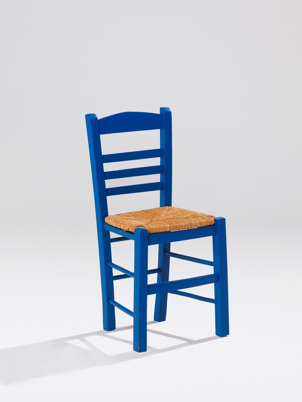 Chair wooden, traditional Greek tavern style, in white and blue colors.